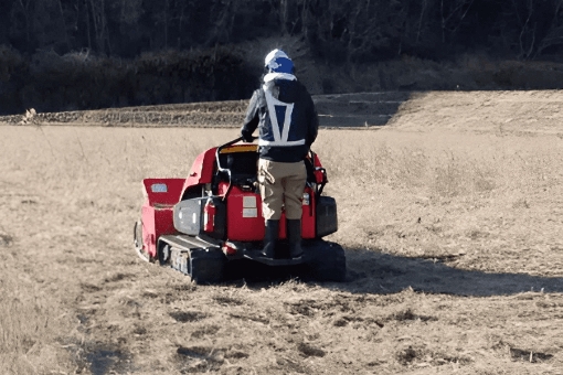自走式で、荒れ放題の密集した雑草を楽々刈り取ります。仮払機では手間がかかって大変な広域作業に大活躍。